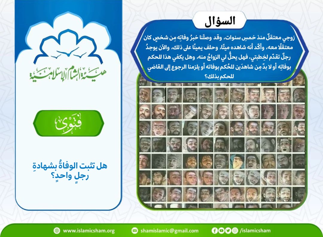 زوجي معتقلٌ منذ خمسِ سنوات، وقد وصلَنا خبرُ وفاتِه مِن شخصٍ كان معتقلًا معه، وأكّد أنه شاهده ميتًا، وحلف يمينًا على ذلك، والآن يوجدُ رجلٌ تقدّم لخِطبتي، فهل يحلُّ لي الزواجُ منه، وهل يكفي هذا للحكم بوفاتِه أو لا بدّ مِن شاهدَين للحُكم بوفاته أو يلزمنا الرجوع إلى القاضي للحكم بذلك؟