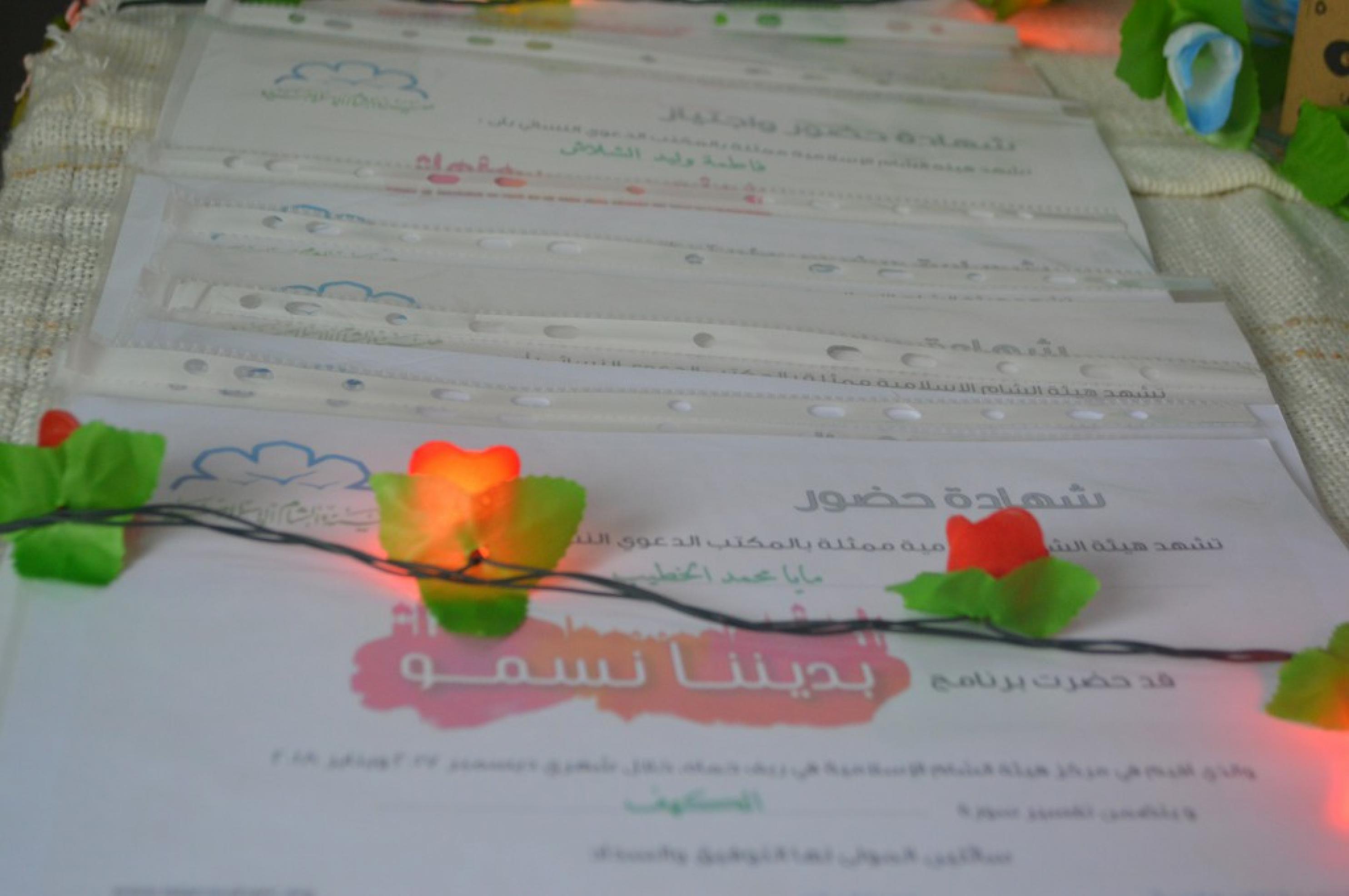 واصل المسار الدعوي في القسم النسائي بهيئة الشام الإسلامية خلال شهر تشرين الأول-أكتوبر 2018م مشروع (بديننا نسمو) في مركز ريف حماة، بمشاركة 35 مستفيدة، وفي مركز مخيمات أطمة بمشاركة 54 مستفيدة، فيما اختتمت أعمال المشروع ذاته في مركز إدلب، واستفادت منها 30 امرأة.